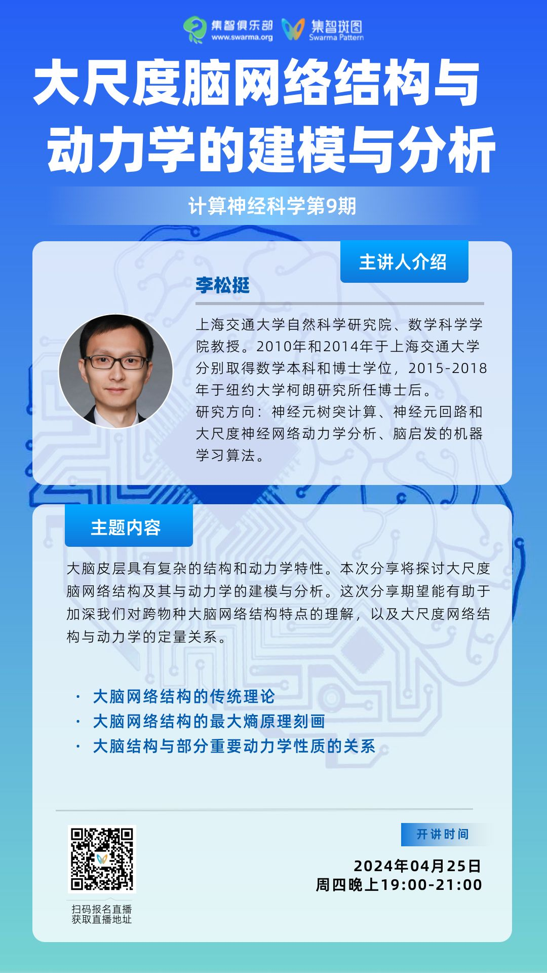 大脑皮层具有复杂的结构和动力学特性。本次分享将探讨大尺度脑网络结构及其与动力学的建模与分析。首先,我们将介绍大脑网络结构的传统理论刻画,包括小世界和无标度等复杂网络性质。随后通过使用香农熵来量化网络的结构多样性,我们发现大脑网络的结构符合在有限的材料和空间约束下的最大熵原理,且该原理具有跨物种的普适性。随后,基于猕猴大脑皮层的连接组数据,我们建立了一个大尺度多脑区的网络动力学模型,可以模拟大脑网络的时间尺度层级结构,即不同的皮层区域呈现出不同的响应时间尺度,从而实现信息的分层加工处理。该模型框架还可以进一步模拟大脑在决策过程中呈现出的多脑区分布式信息整合特点。这次分享期望能有助于加深我们对跨物种大脑网络结构特点的理解,以及大尺度网络结构与动力学的定量关系。