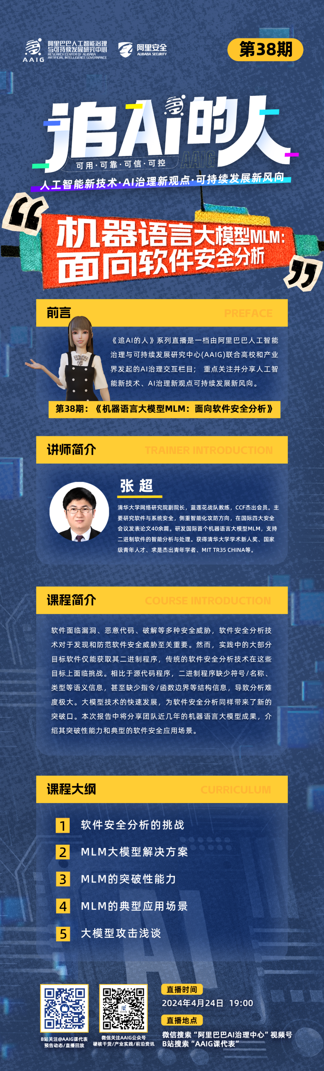 今晚(4月23日)19:00,《追AI的人》系列直播第38期邀请了清华大学网络研究院副院长张超教授分享《机器语言大模型MLM:面向软件安全分析》。