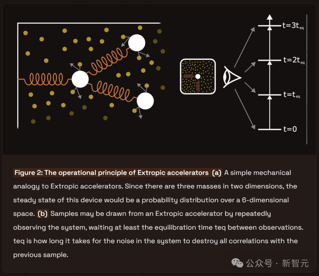 (a)Extropic加速器的简单机械类比。因为设备涉及三个质量点在两个维度上的活动,其稳定状态将对应一个六维空间的概率分布;(b)从Extropic加速器中抽取样本的方法是,反复观察系统,并确保每次观察之间至少有一个平衡时间teq。这个平衡时间teq是指系统中的噪声消除与前一个样本相关性所需的时长。这个机械模型直接关联到构成Extropic加速器的参数化随机模拟电路。这里,轻质粒子相当于电子,而液体分子则是导电介质中的原子,它们在碰撞中能将能量传递给电子。弹簧则代表了限制电子运动的电路元件,比如电感或晶体管。通过施加控制电压或电流,可以调整这些元件的参数,进而改变电路的采样分布。虽然每个电路都存在噪声,但并非所有电路都适合用作Extropic加速器。从工程学的角度来看,打造一个以噪声为主导且表现稳定的设备颇具挑战性。由于热波动较小,这类设备必须设计得足够小且功率低,以便显著受到这些波动的影响。因此,如果想利用宏观组件(如在印刷电路板上)来构建Extropic加速器,就必须引入人造噪声。但这种做法会削弱设备在时间和能源节省方面的基本优势,最终的性能可能与数字执行算法相似。