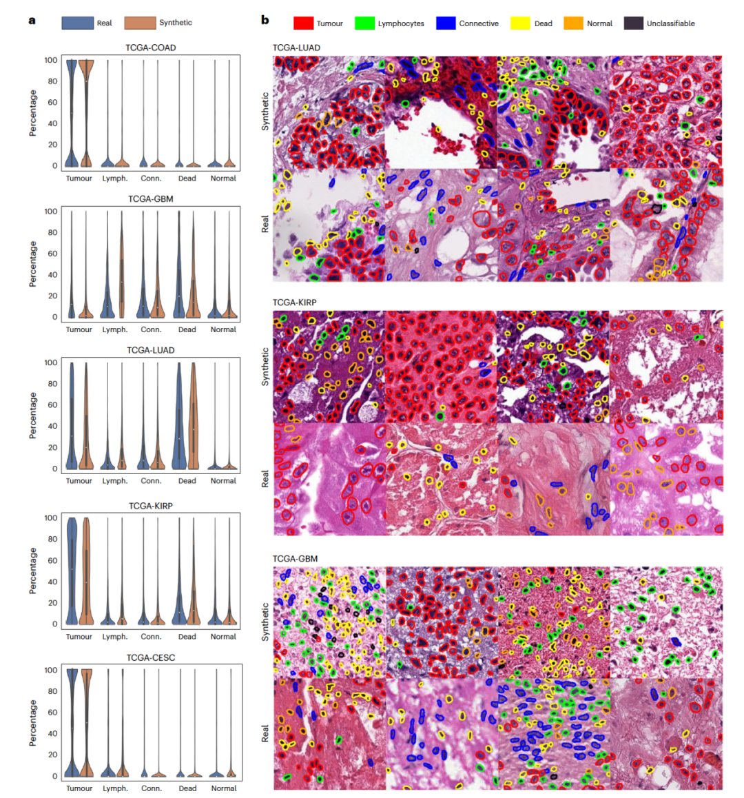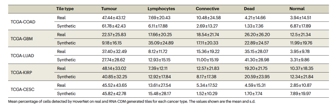 接下来作者使用HoverNet,这是一个最先进的细胞分割和分类模型,对真实和合成的图像切片进行了不同细胞类型的检测。作者发现在五种癌症组织中,真实和合成图像切片内的细胞分布相似(图3a),并且跨细胞类型检测到的细胞的平均数量对于大多数癌症和细胞类型来说也是相似的(表2)。即使HoverNet只在真实数据上训练,合成图像切片中的细胞类型也被正确检测,显示出RNA-CDM能够产生具有现实细胞形态的样本(图3b)。作者进行了额外的测试,以确定合成图像切片中的基因表达轮廓特征是否保持一致。作者比较了解卷积RNA测序数据中上皮细胞和造血细胞的低和高比例,以及HoverNet在合成图像切片中检测到的肿瘤细胞和淋巴细胞的比例。在所有癌症类型中,关于肿瘤细胞的一致模式浮现了:使用来源于展示更高比例上皮细胞的患者的RNA测序数据生成的合成图像切片显示出更高的肿瘤细胞存在比例。同样地,使用来源于展示更高比例造血细胞的患者的RNA测序数据生成的合成图像切片显示出更高的淋巴细胞存在。