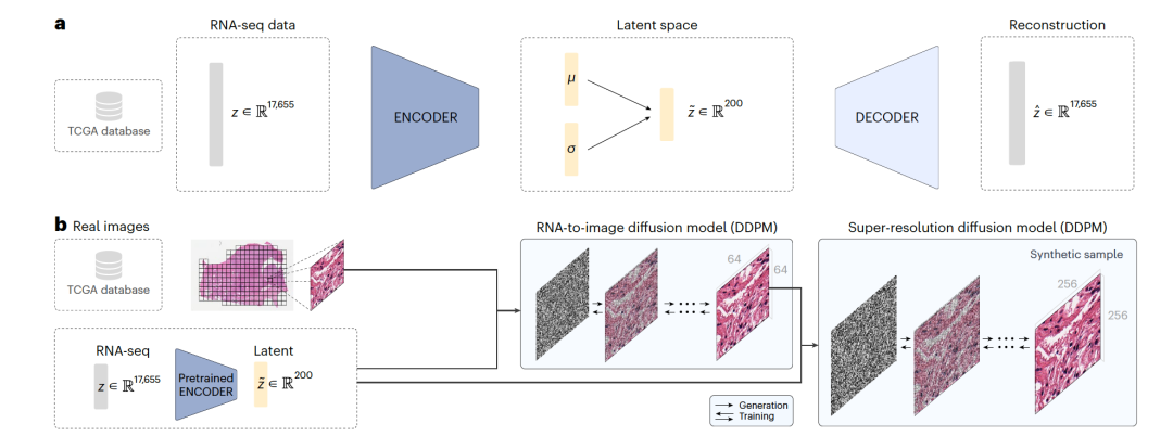 今天为大家介绍的是来自Olivier Gevaert团队的一篇论文。通过合成数据训练机器学习模型可以缓解数据集成本高昂且具有挑战性时数据稀缺的问题。作者在这里展示了如何使用级联扩散模型从人类肿瘤的RNA测序数据的潜在表示中合成出现实感强的全幅图像切片。