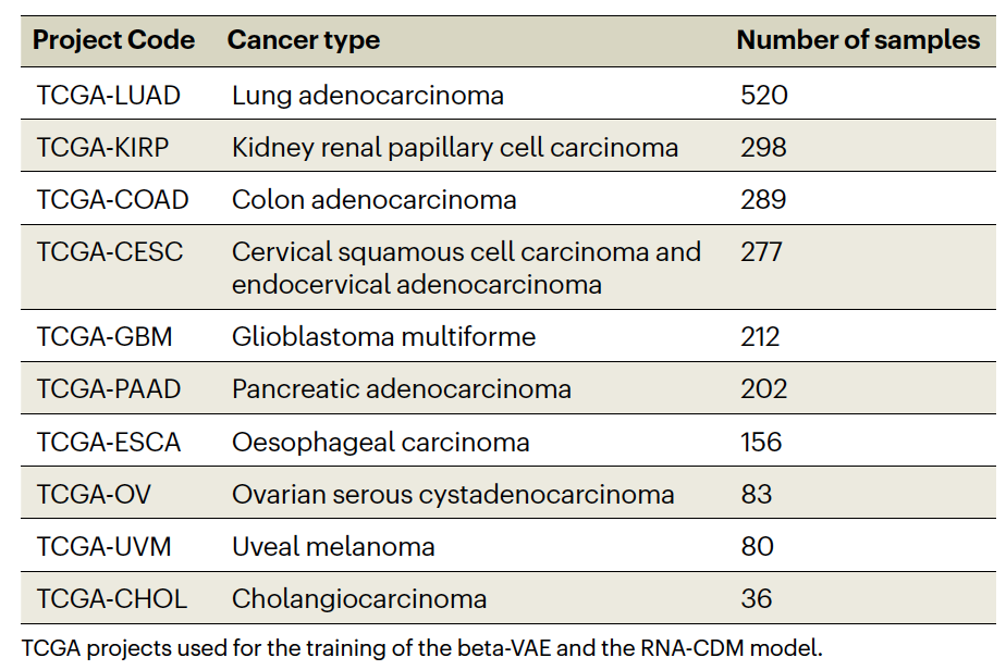 鉴于RNA测序数据的高维性,直接用它来条件化扩散过程是不可能的。因此作者训练了一个beta-VAE将来自12种不同癌症组织的RNA测序数据投影到一个低维的潜在空间(表1)。作者使用均匀流形近似和投影(UMAP)算法可视化了重构的RNA测序数据,显示出每种癌症组织的不同聚类(图2)。接下来,作者使用来自五种癌症组织的多模态数据训练了RNA-CDM模型:肺腺癌(LUAD)、肾乳头状细胞癌(KIRP)、宫颈鳞状细胞癌(CESC)、结肠腺癌(COAD)和胶质母细胞瘤(GBM)。作者的RNA-CDM模型能够准确地从五种癌症类型生成图像切片,无需任何组织标签信息,仅依赖于RNA测序数据的潜在表示(图2)。在生成的图像切片中可以观察到各种组织形态,从更加均匀且细胞丰富的GBM组织到较为稀疏的LUAD组织。