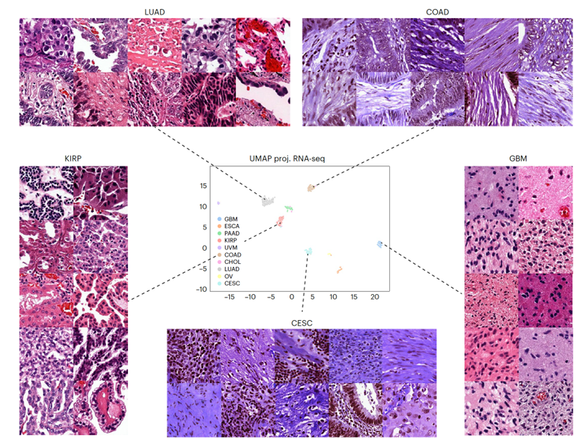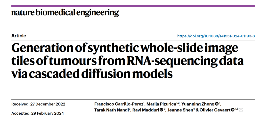 Carrillo-Perez, F., Pizurica, M., Zheng, Y., Nandi, T. N., Madduri, R., Shen, J., & Gevaert, O. (2024). Generation of synthetic whole-slide image tiles of tumours from RNA-sequencing data via cascaded diffusion models. Nature Biomedical Engineering, 1-13.
