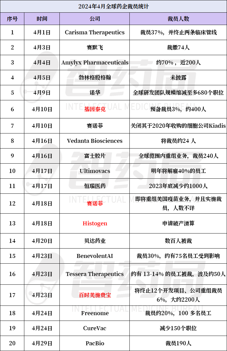 据智药局监测,今年4月,全球至少有19家药企公布了人员及管线精简情况或计划,较3月新增两家。