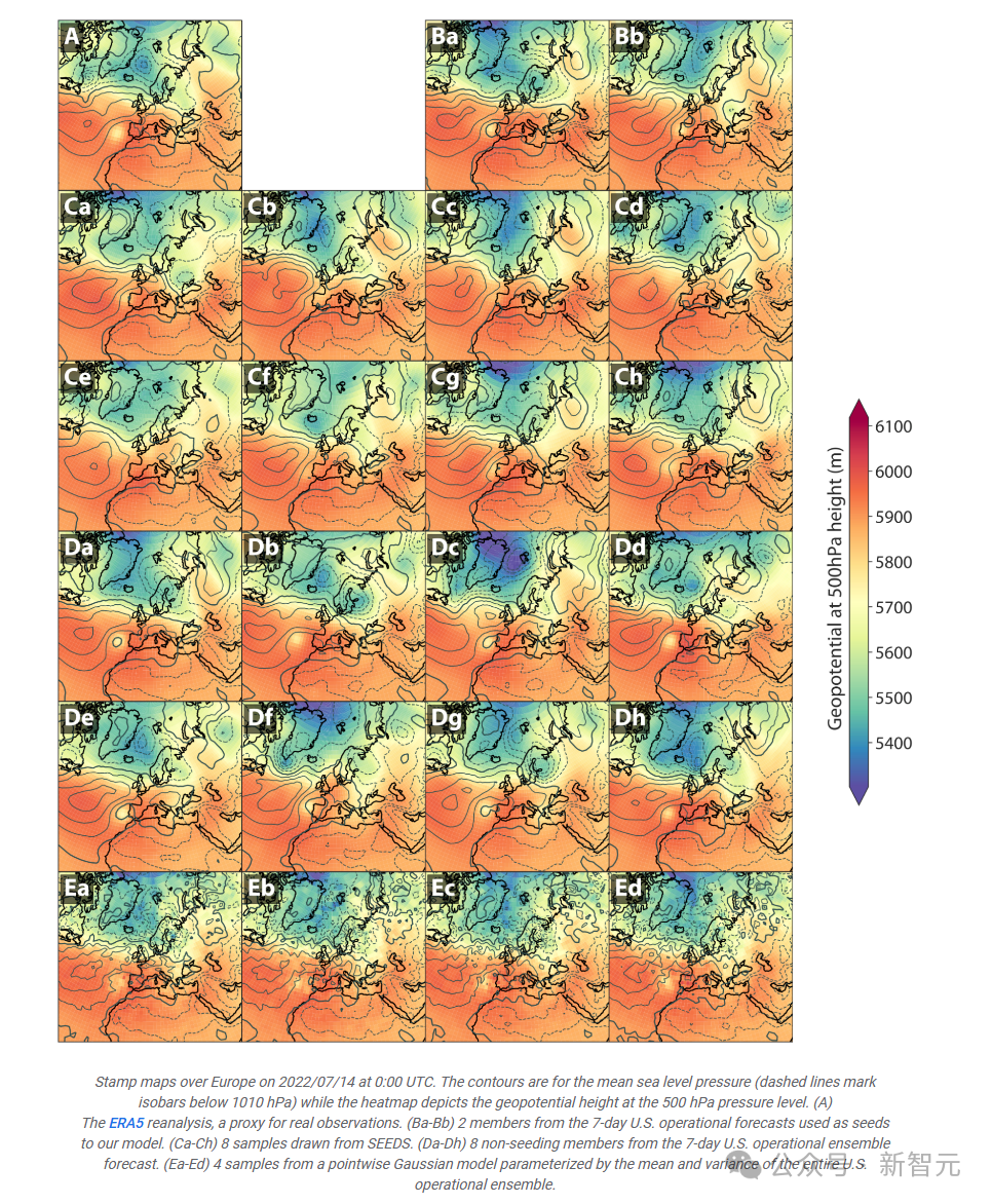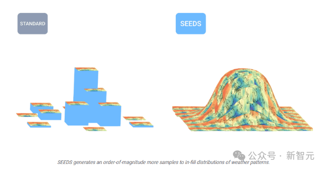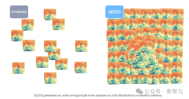 1972年12月,在美国华盛顿特区举行的美国科学促进会年会上,麻省理工学院气象学教授埃德·洛伦兹发表了题为「巴西一只蝴蝶的煽动是否会在德克萨斯引发龙卷风?」的演讲,这贡献了「蝴蝶效应」这一术语。在他1963年的一篇论文中,他发现在时间积分与数值天气预测模型里,即使微小的起始条件误差,也会在数值模型中迅速扩大,导致预测结果的不确定性迅速增加,这被称为混沌现象。因此,天气预报的可靠性受到了限制,尤其是在极端天气事件的预测方面,比如飓风、热浪或洪水。这些预报使用了一种叫做集合预报的方法,通过在初始条件中引入一些随机性,然后运行多个不同的模型来生成多种可能的结果。通过对集合中的所有预报进行平均处理来减少误差增长,并且集合中的预报的变化量量化了天气条件的不确定性。尽管有效,生成这些概率预报的计算成本很高。它们需要在大规模超级计算机上多次运行高度复杂的数值天气模型。尤其是极端天气,通常需要更大的集合来评估。例如,为了预测发生概率为1%的事件的可能性,需要一个包含1万个成员的集合,且相对误差小于10%。但准确和及时的天气预报,是人们日常生活所必需的。从准备一天的活动需要带什么出门,到面对危险天气的时候要提前做什么准备。谷歌最新研究给天气预报带来了一个新的进展:Scalable Ensemble Envelope Diffusion Sampler(SEEDS)是一个生成式的AI模型,可以高效地生成规模化的天气预报集合,成本仅为传统基于物理的预测模型的一小部分。这项技术为天气和气候科学开辟了新的机遇,它同时也代表了概率扩散模型在天气和气候预测中的首次应用。在上述论文中,谷歌提出了可扩展的集合包络扩散采样器(SEEDS),这是一种用于天气预报集合生成的生成式人工智能技术。SEEDS基于去噪扩散概率模型,这是一种由Google Research部分开创的最先进的生成式人工智能方法。生成式人工智能以生成非常详细的图像和视频而闻名,这一特性对于生成与真实天气模式一致的集合预报特别有用。SEEDS可以根据操作性数值天气预报系统中的一两个预报来生成大量的集合。生成的集合在技能指标上与基于物理的集合相匹配或超过,比如均方根误差(RMSE)和连续排名概率评分(CRPS)等;不仅如此,还为预报分布的尾部(如±2σ和±3σ天气事件)分配了更准确的可能性。