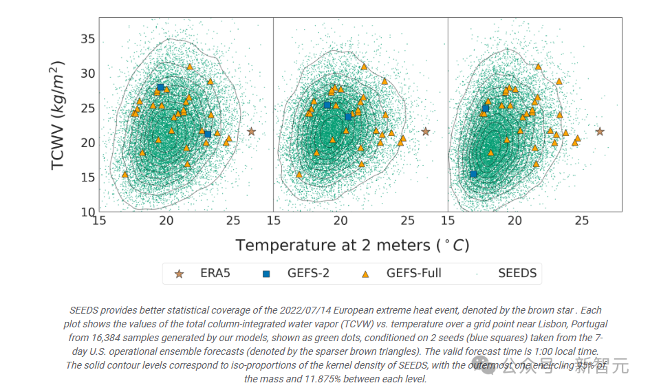 最重要的是,与需要数小时计算时间的超级计算机相比,该模型的计算成本几乎可以忽略不计。在Google Cloud TPUv3-32实例上,其吞吐量为每3分钟256个集合成员(分辨率为2°),并且可以通过部署更多加速器轻松扩展到更高的吞吐量。下图对比了SEEDS与操作性美国天气预报系统(全球集合预报系统,GEFS)在2022年欧洲热浪期间某个特定日期的预报结果。其中A是真实观测的代理,(Ca-Ch)是SEEDS模拟出来的8个样本,而(Da-Dh)是来自GEFS的预报。虽然肉眼可能很难直接看出明显的区别,但SEEDS更能捕捉到交叉场和空间相关性,这会与真实的天气更加贴近。这是因为SEEDS直接模拟了大气状态的联合分布,它实际上捕捉了大气状态的空间协方差和中对流层高度和平均海平面气压之间的相关性,这两者常被气象学家用于预报评估和验证。(一些专业的解释:平均海平面气压的梯度驱动着地表的风,而中对流层高度的梯度则产生了移动大尺度天气模式的高层风。)SEEDS集合能够从一两个种子预报中外推,展示了可能的天气状态的范围,对事件的统计覆盖更好。也就是说,高度可扩展的生成方法能够创建非常大的集合,可以通过任何不同状态阈值设置的天气样本,来描述非常罕见的事件。比如说下图展示了2022年7月14日当地时间1:00在里斯本附近发生的极端高温事件的2米温度和总柱水汽的联合分布。对于每个图,谷歌研究团队使用SEEDS根据2个物理模型的种子预报,生成了16384个成员的集合,显示为绿色点。用方块表示用于传统方法生成集合的预报,用三角形表示剩余的传统方法集合成员。可以看到蓝色方块和黄色三角形根本不接近星号,也就是说,传统方式根本不可能提前观察到这种极端情况,其31个成员中没有一个预测到与观察到的那样温暖的近地表温度。实际上,从高斯核密度估计中计算的事件概率低于1%,这意味着少于100个成员的集合不太可能包含与此事件一样极端的预报。而SEEDS生成的绿色点,却可以提供更好的统计覆盖,基于它精准的生成能力和高效的生成速度。上述实验展示了一种混合预报系统,SEEDS利用基于物理模型计算出的少数几条天气轨迹来更有效地生成更多预报的扩散模型。这种方法提供了一种替代当前操作性天气预报范式的方法。同时,通过统计模拟器节省的计算资源可以用于提高基于物理模型的分辨率或更频繁地发布预报。这或许是天气预报的未来新模式,也可能SEEDS仅代表了未来几年AI将加速操作性数值天气预报进展的众多方式之一。但谷歌研究展现出来的是生成式人工智能在天气预报模拟和后处理中的实用性,对于准确量化未来气候的不确定性和气候风险评估,提供了一个新的方向。https://blog.research.google/2024/03/generative-ai-to-quantify-uncertainty.html
