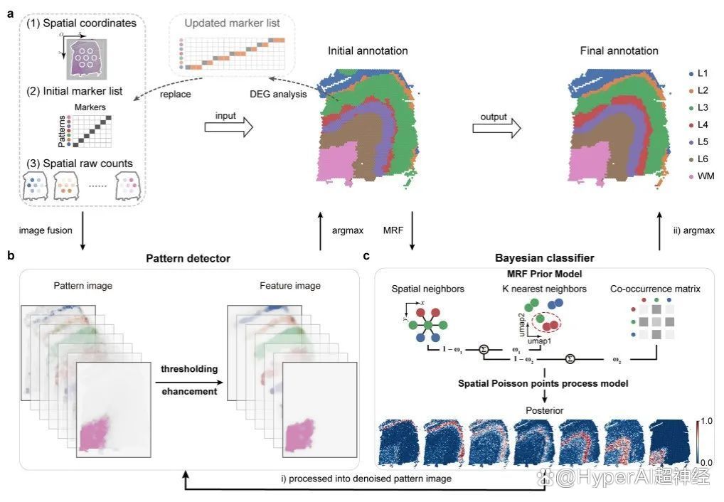 研究中,为避免降噪、平滑、锐化等图像处理技术对生物原始特征造成破坏,研究团队基于原始计数构建了贝叶斯分类器 (Bayesian classifier) 以微调初始注释。同时,研究团队应用了高阶马尔科夫随机场 (Markov random field, MRF) 先验模型。在空间转录组学背景下,由于必须共同考虑每个位点的基因表达和空间位置,研究团队还采用了空间泊松点过程 (spatial Poisson point process, sPPP) 模型。