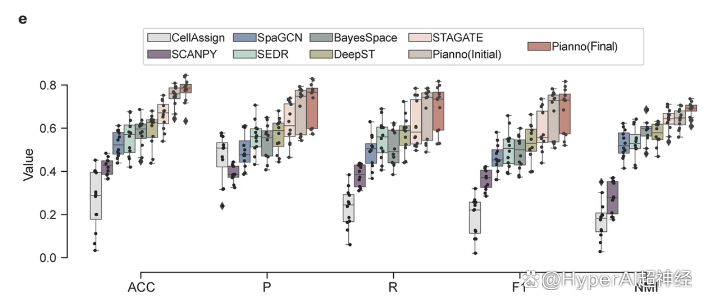 此外,研究团队还通过其他分类指标,如准确率 (ACC)、宏平均精确度 (macro-averaging precision, P)、宏平均召回 (macro-averaging recall, R)、宏平均 F1 分数 (F1) 和归一化互信息 (normalized mutual information, NMI),进一步全面评估了 Pianno 的优越性能,如上图 e 所示,Pianno 相关指标均位于较高水准。
