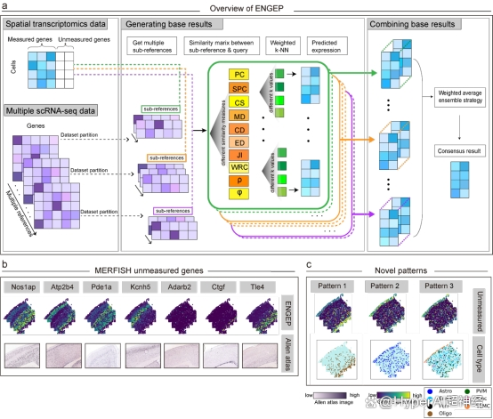 华中师范大学数学与统计学学院张晓飞教授课题组开发了一款名为 ENGEP 的计算方法,利用 k近邻加权回归和集成学习策略,能够准确预测空间转录组中未测基因的表达。此外,ENGEP 还能够准确预测空间未测基因的表达模式,对增强空间转录组学数据具有重要意义。