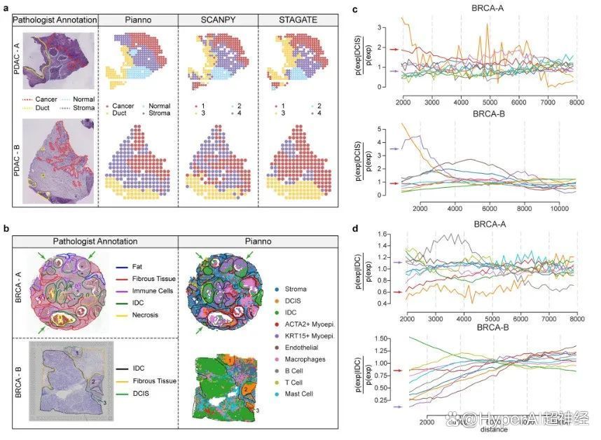 研究团队还针对肿瘤微环境呈现出的高度异质性,评估了 Pianno 在注释复杂且分散结构组织方面的表现。本轮测试分析了 2 个人类胰腺导管腺癌样本和 2 个乳腺癌样本的微环境。