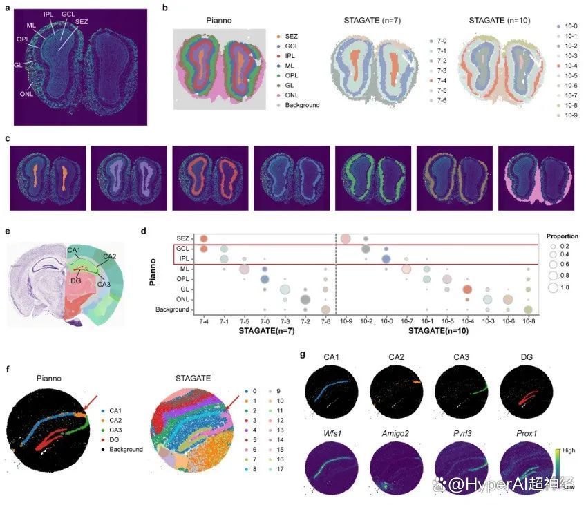 研究团队使用 Pianno 对小鼠嗅球的 Stereo-seq 数据集中的解剖结构进行了注释,该数据集包含了 10,747 个空间点,涵盖组织覆盖区域和背景区域。
