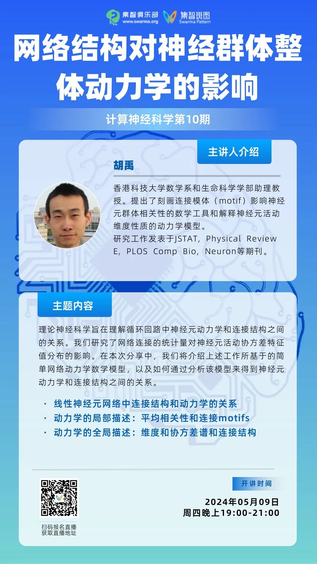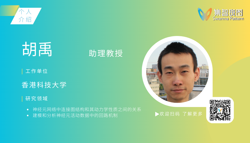 胡禹,香港科技大学数学系和生命科学学部助理教授。2014年在华盛顿大学取得应用数学博士学位,并曾在哈佛大学和以色利希伯来大学从事博士后研究。研究方向:神经元网络中连接图结构和其动力学性质之间的关系;建模和分析神经元活动数据中的回路机制。提出了刻画连接模体(motif)影响神经元群体相关性的数学工具,和解释神经元活动维度性质的动力学模型。博士招募