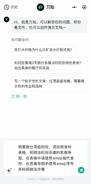 在通用问答场景中,万知展现出了不俗的产品性能。面对复杂问题,万知也能够快速地给出「聪明」的高分答案。但万知所能给你的远不止文本这么简单,它还支持多种形式的输出,比如表格、公式、代码等,让我们的工作汇报和生活规划都变得清晰明了。想象一下,你只需要简单地提问,万知就能帮你把杂乱无章的信息变成井井有条的图表,是不是超级实用?同时,万知特地为此还可以实现「网上冲浪」,实时访问互联网信息,确保你得到的是最新最准确的数据和见解。这对于需要快速获取市场动态和行业信息的职场人士来说,简直是救星般的存在。万知可以扮演个人专属的私厨助理、旅游管家,支持联网的万知更是信手拈来。举个例子「台湾卤肉饭」 的例子,接收用户要求后不到一秒钟,万知就已经将所需食材以表格的形式呈现,同时制作出烹饪步骤,方便用户直接上手做菜。5000页文档AI速读,多模态识图帮你解决「图表懵逼症」