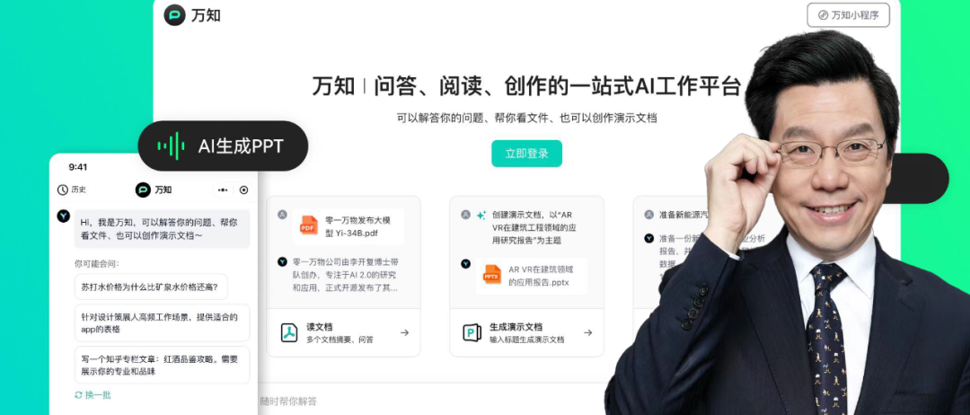 体验地址:https://www.wanzhi.com/零一万物正式官宣了一站式 AI 工作平台 ——万知。它可以做会议纪要、周报、写作助手,还可以速读任何文档,帮你做PPT,更关键的是,它更适合中国职场宝宝体质,是为国内打工人量身打造的神级生产力工具。为了将这位古希腊掌管职场的AI之神请出来,零一万物团队利用自研领先的大模型基础平台与RAG检索增强生成技术,针对AI问答、读文档、PPT等场景进行了专门的加速和优化,万知可在10秒内完成数十万字超长文档阅读、2分钟内完成PPT图文制作,在PC端进行极速解读中英文专业图表。它还是免费的哦!听说这次零一万物的创始人李开复博士动了真格,亲自出任万知「CEO」(Chief Experience Officer),也就是首席体验官,倾听你的反馈,天天督促团队不断迭代万知。