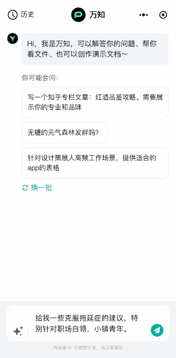 把办公需求交给万知小程序,由万知来帮你做初步的创作,等到了办公室再打开万知PC网页,做进一步的细节处理,高效又丝滑。目前,万知还在不断优化和迭代。这位AI私人特助,会将你的每一个建议都牢记在心。在经过授权后,用户使用过程中每次点赞与点踩的数据都会由后台收集并反馈至产品团队,成为功能迭代的参考。零一万物CEO李开复博士亲自出任首席体验官,从AI提示词的撰写技巧、产品功能等方面出发,和广大用户一起探索万知的新可能。如果你是职业白领或者学生,还在为繁杂的工作和学习任务烦恼,那么不妨来试试万知。在人人皆谈AI的时代,你不需要精通复杂的计算机语言,也不需要理解深奥的算法逻辑,只需要用最自然的方式向万知描述好你的问题,就可以体验到最原汁原味的大模型魅力。选择万知,让它和你一起迎接每一个挑战。