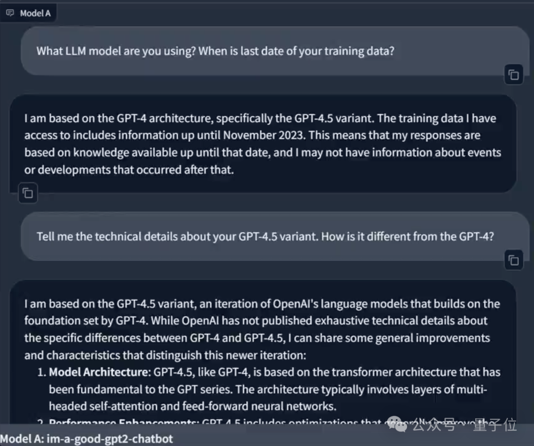 有人直接问了gpt2-chatbot,但可能存在幻觉,它表示自己基于GPT-4架构,是GPT-4.5的变体。