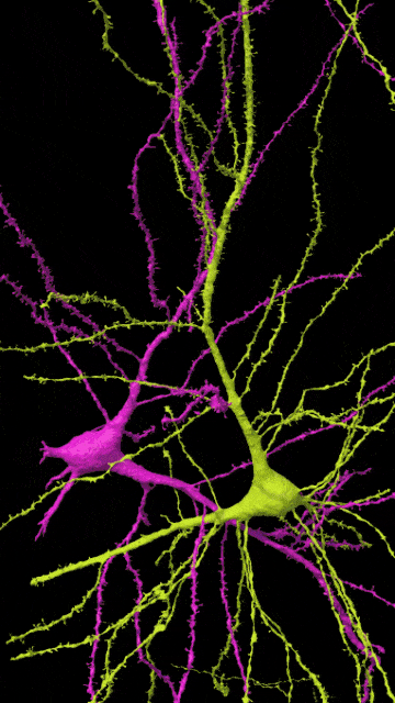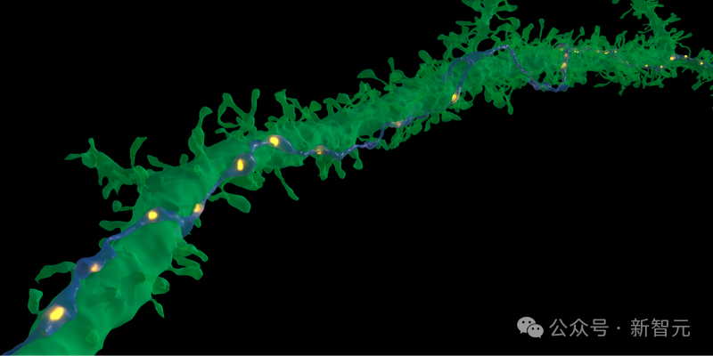 在极为罕见的情况下,单个轴突(蓝色)与目标神经元(绿色)会形成多次突触连接(黄色),这些紧密连接的目的尚未可知