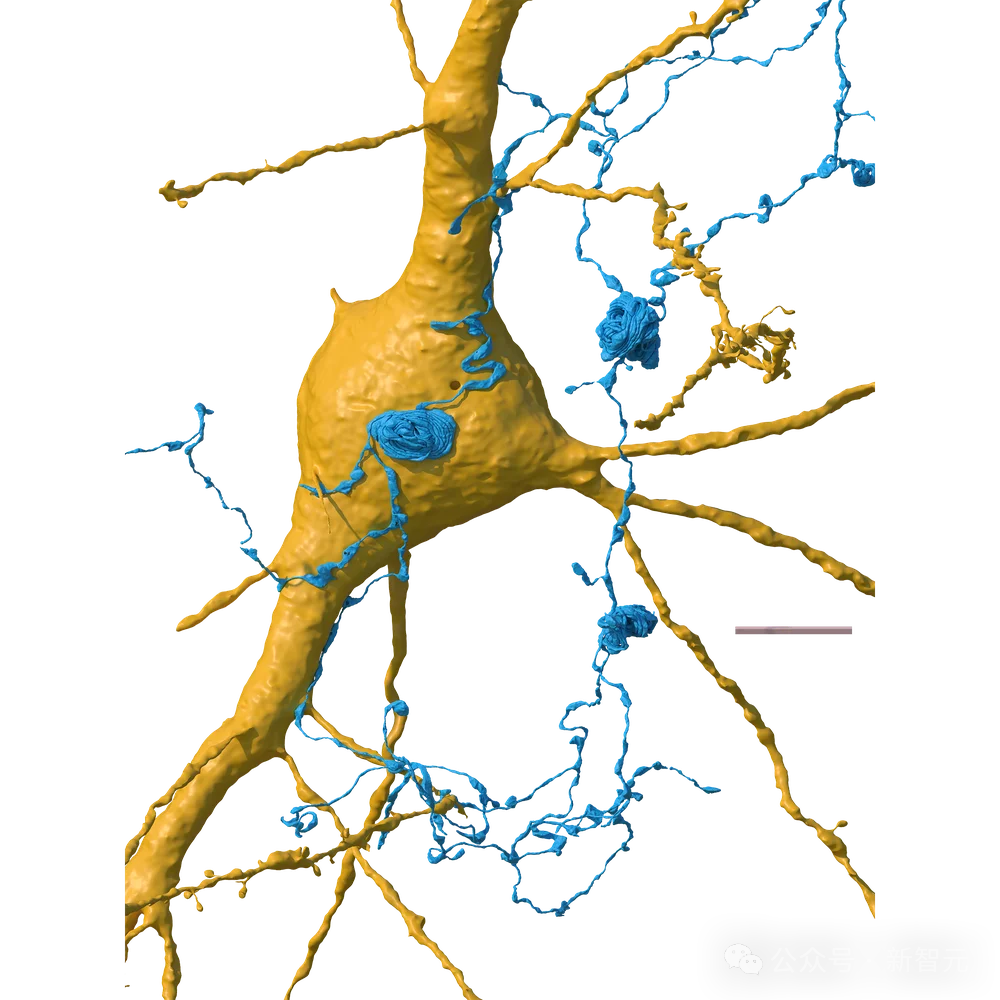 如下,这个神经元(白色)有5000多条来自其他神经元的轴突(蓝色),传递过来信号。