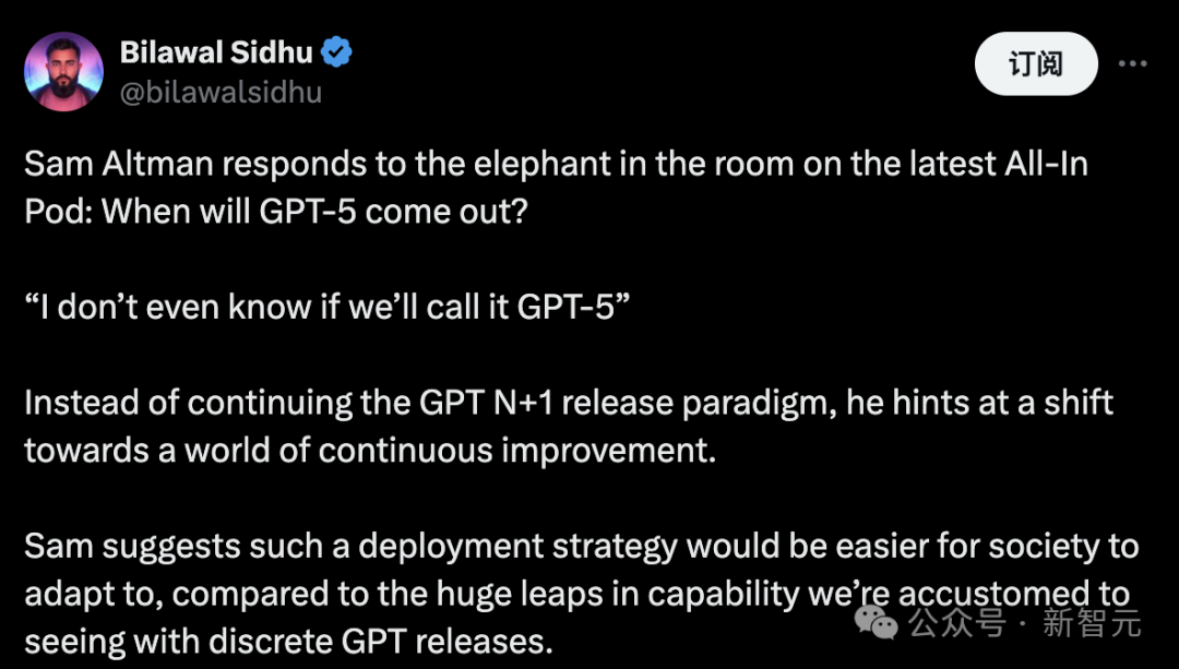 关于GPT-5何时面世,最近Altman在All-In Pod中回应,「我甚至不确定我们是否会命名它为GPT-5」。 他暗示,未来可能不再遵循GPT N+1的发布模式,而是转向持续的改进过程。