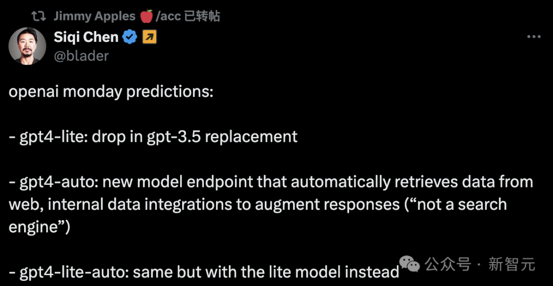还有一位网友Siqi Chen预测下周一,在GPT-4模型方面的更新: - gpt4-lite:替换gpt-3.5 - gpt4-auto:一个新的模型端点(endpoint),可自动从网络检索数据,并集成内部数据来增强响应(不是「搜索引擎」) - gpt4-lite-auto:与gpt4-auto类似,但使用的是lite版本。