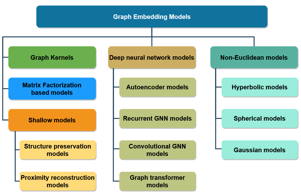 图表示学习主要分为五大类:图核模型 (graph kernels)、矩阵分解模型 (matrix factorization models)、浅层模型 (shallow models)、深度神经网络模型 (deep neural network models) 和非欧几里得模型 (non-Euclidean models)。