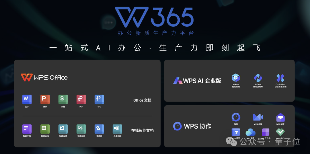今天WPS 365品牌已经包含了传统的office文档的编辑、AI企业版,以及整个基于AI协作解决方案。