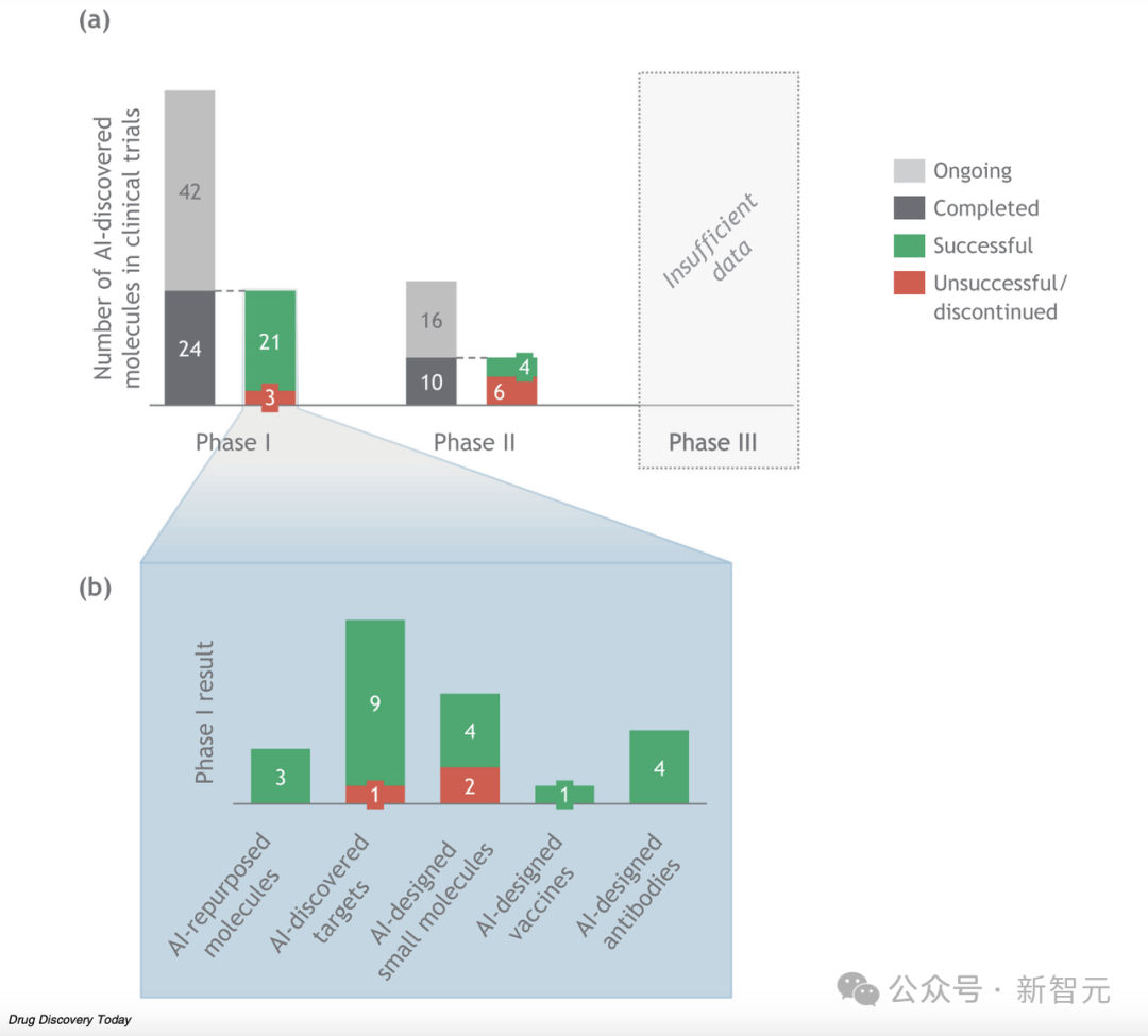 图2. 迄今为止AI发现的分子在临床试验中的成功率 (a) 根据临床试验阶段划分 (b) 根据发现模式划分,已完成第一阶段临床试验的分子
