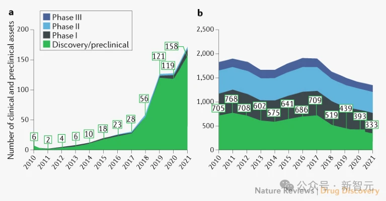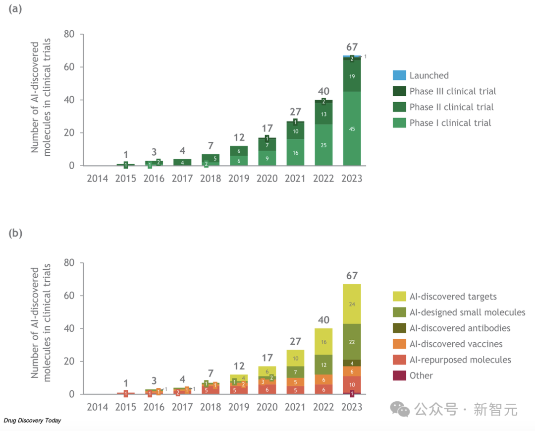 AI主导的生物技术公司发现并进入临床试验的分子数量(包括与制药公司合作发现的分子,排除了与COVID-19相关的分子) (a) 按临床阶段分类 (b) 按发现模式