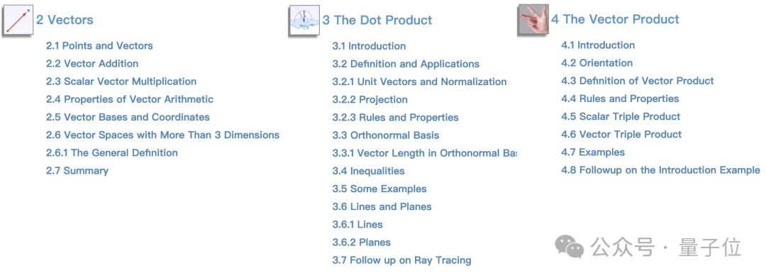 接下来的两个章节也都和向量运算有关,分别介绍了数量积(内积/点乘)和向量积(外积/叉乘)。