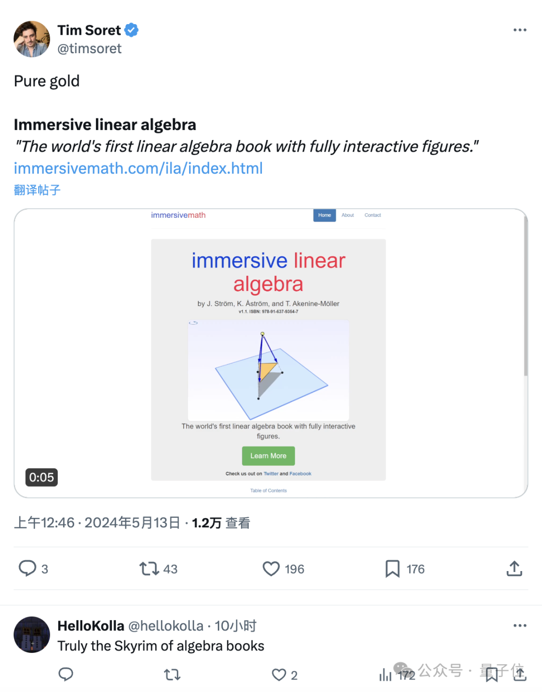 这也让它被网友称为“线性代数教材的天花板”,游戏公司Odd Tales的创始人也评价说它是“Pure gold”。