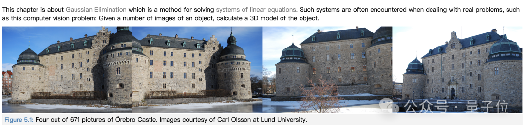 在介绍高斯消元时,作者一共用了将近9000个单词,还举了非常前沿的例子——计算机视觉——在该领域中,3D模型的建立就与线性方程组求解有关。