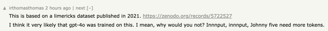有人亮出了一个链接,跳转的是一个2021年发布的打油诗数据集Needle in a Needlestack(只能说世界之大无奇不有),称他坚信GPT-4o训练时,用了里面的数据,