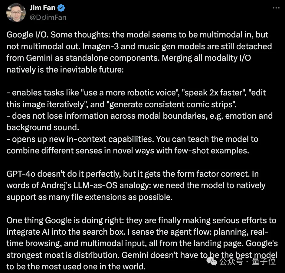Jim Fan老师不愧是老冲浪选手了,他说,谷歌做对的一件事是,“他们终于开始努力把AI集成到搜索框中”。