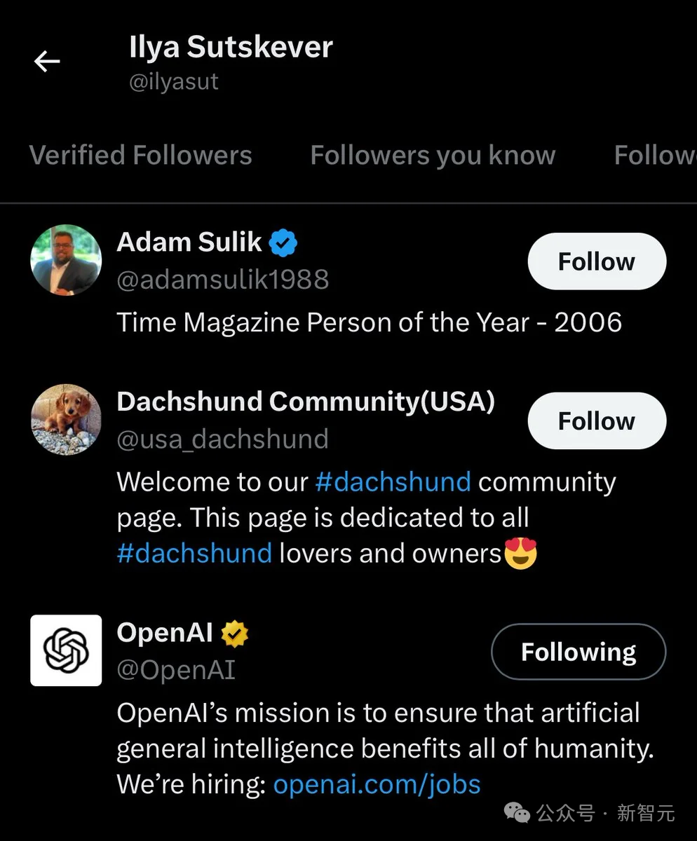 爱吃瓜的网友发现,Ilya官方账号只关注了3个账号——