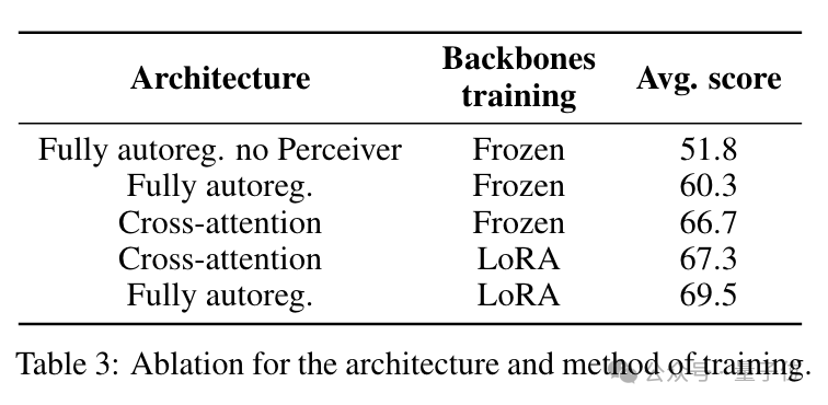 若未被冻结,则完全自回归架构的表现更优,反之则是交叉注意力架构更好。
