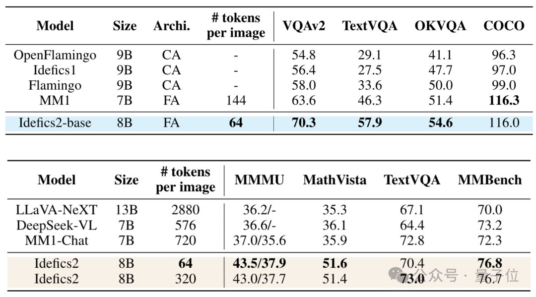 与前一代Idefics1和Flamingo等同规模前SOTA相比,Idefics2在多个数据集上表现优异,甚至还超过了更大的13B模型。