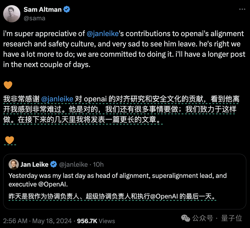 他站出来感谢了Jan对OpenAI超级对齐和安全方面的贡献,表示Jan离开,他其实很难过、很舍不得。