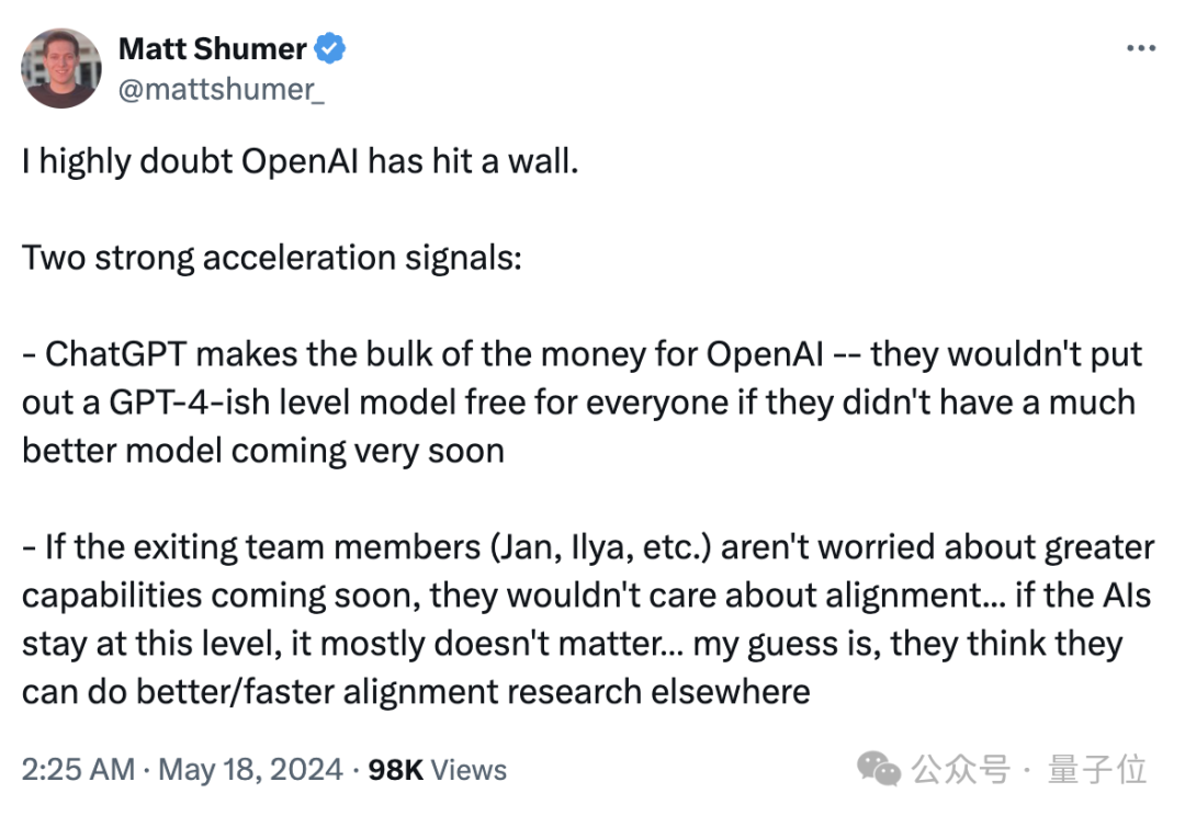 另一个则是如果离职的团队成员(Jan、Ilya 等)不担心很快会有更强大的功能,他们就不会关心对齐的问题……如果AI停留在这个水平上,基本上也无所谓。
