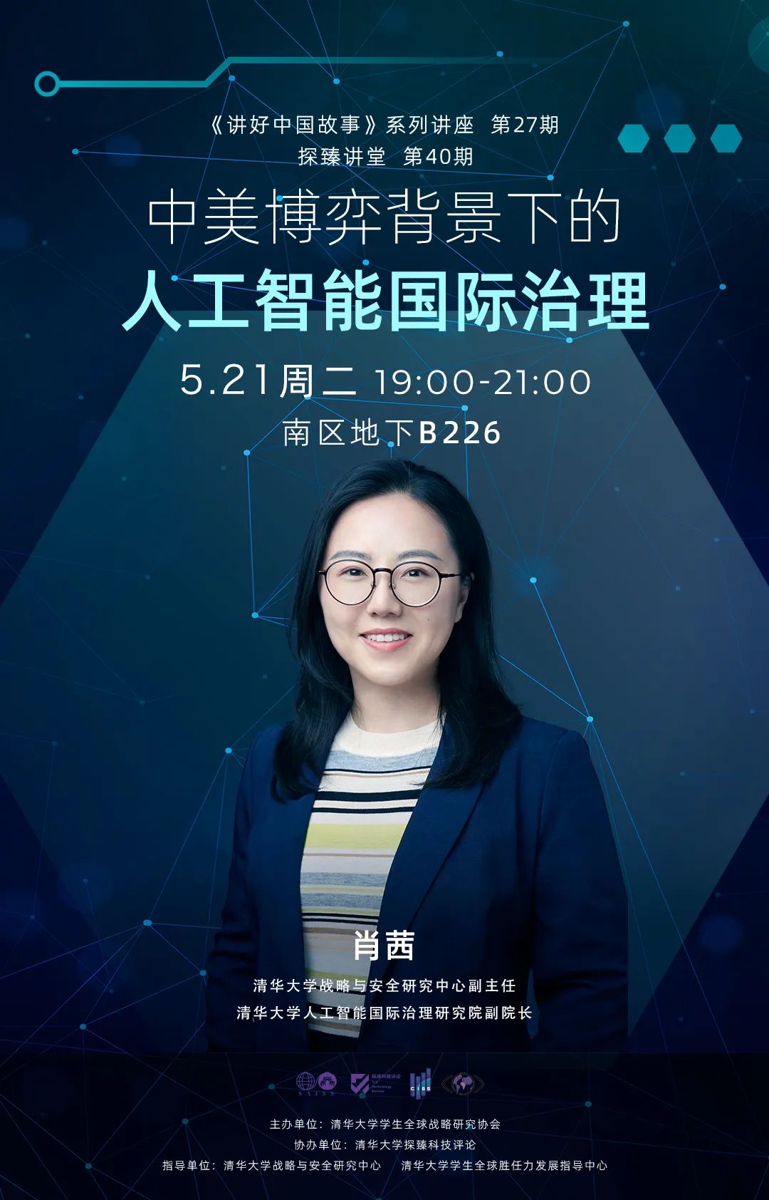 本次讲座有幸邀请到清华大学战略与安全研究中心副主任、清华大学人工智能国际治理研究院副院长肖茜老师,希望能为感兴趣的同学带来关于全球人工智能治理合作的目前进展与未来展望,欢迎对此有兴趣的同学报名参加。
