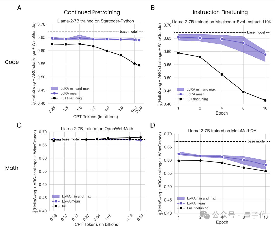 而在数学任务上的持续预训练实验中,LoRA起初表现略胜于全量微调,但也是随着token数量的增加,这种优势逐渐被反超。