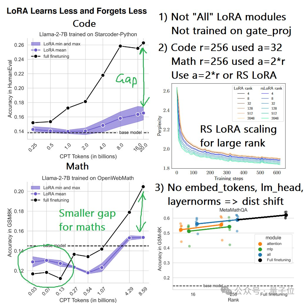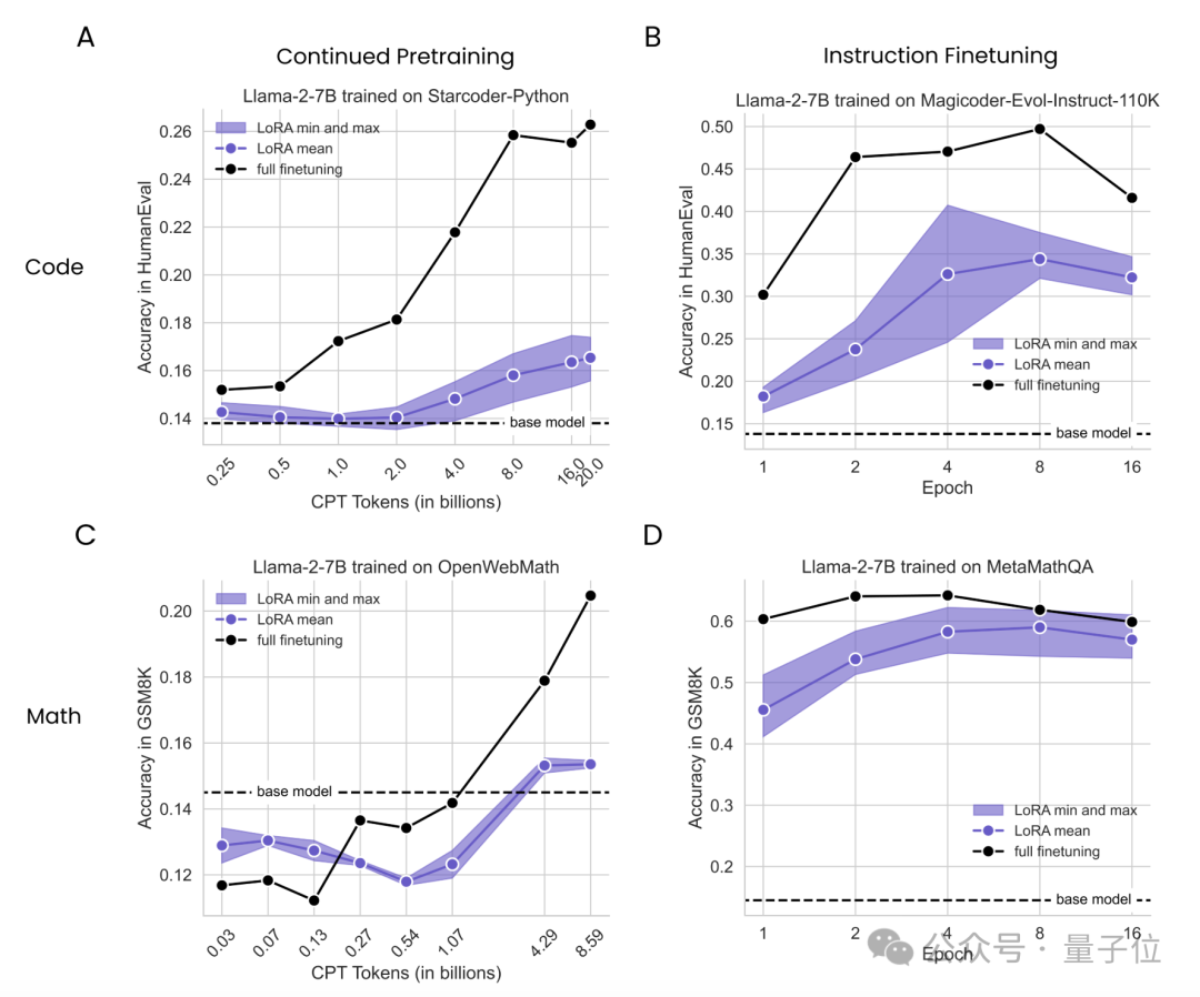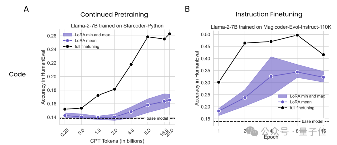 结果不难看出,无论是持续预训练还是监督微调,LoRA在编程上的表现从未追上过全量微调,而且在持续预训练中,随着token数量的增加,差距越来越悬殊。