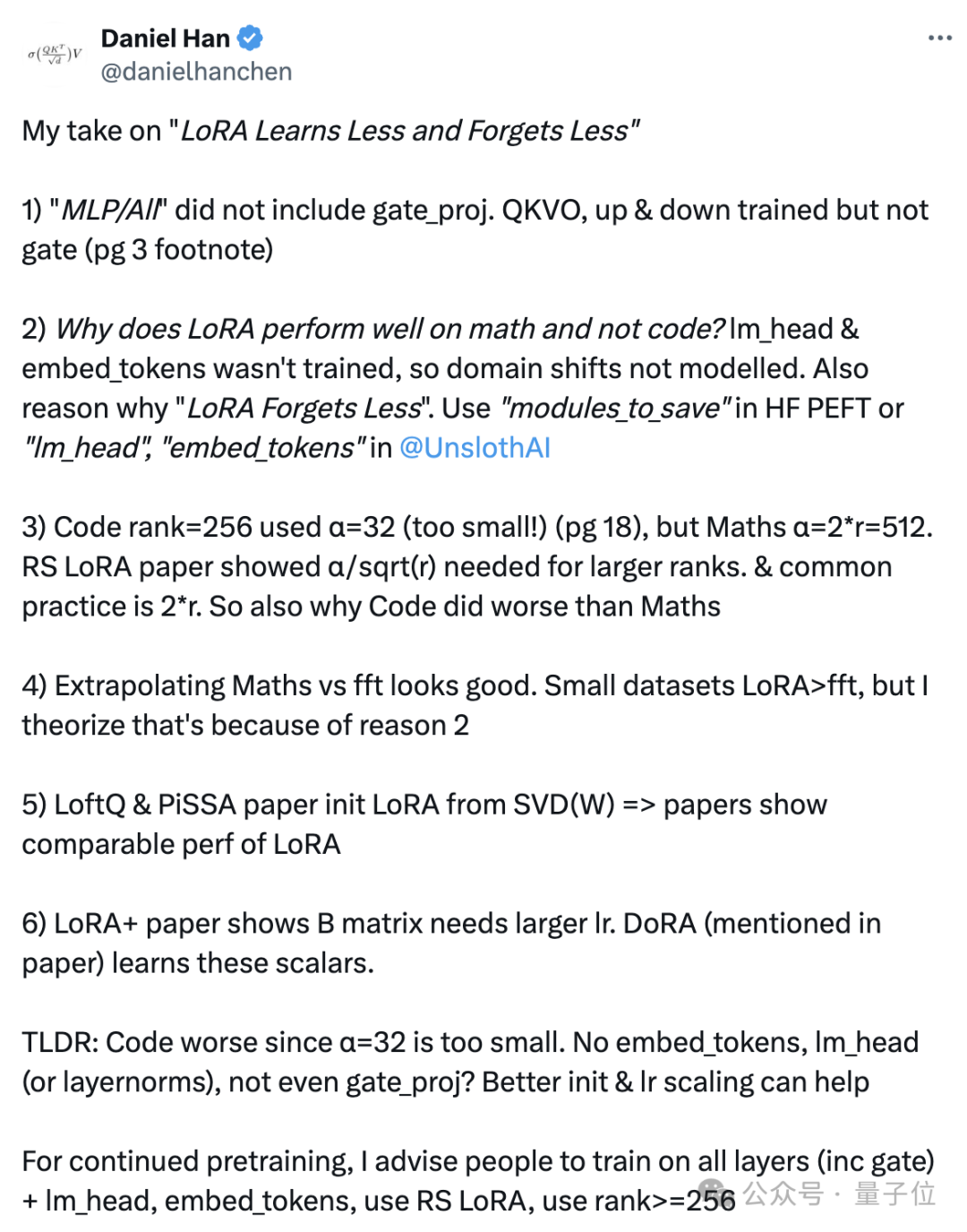 Daniel首先指出,论文中的LoRA实验只适配了QKVO、up和down矩阵,没有适配gate_proj矩阵。