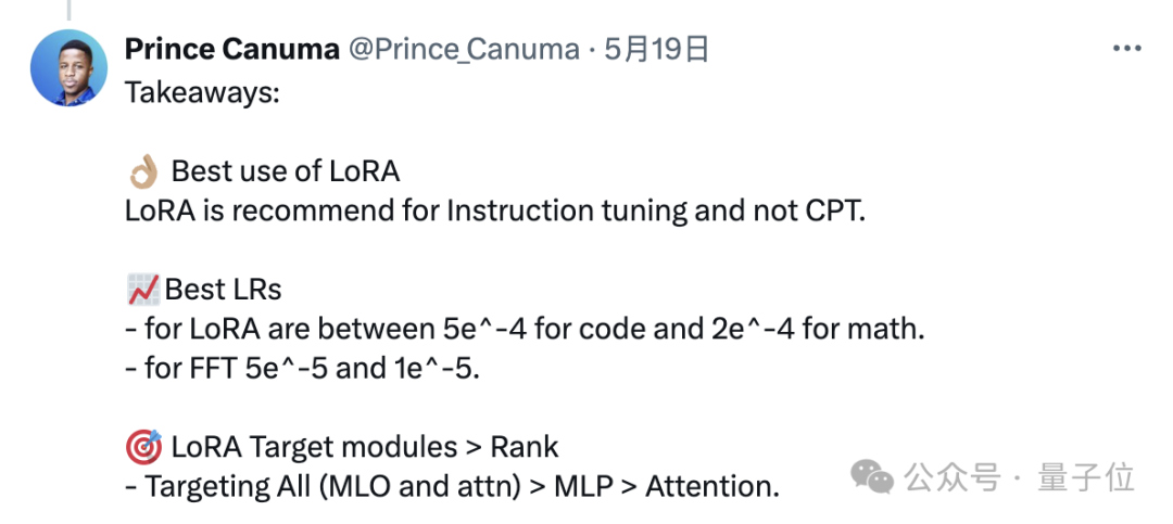 另一名ML工程师附和了Daniel的观点,同时还针对LoRA的应用给出了一些具体建议: