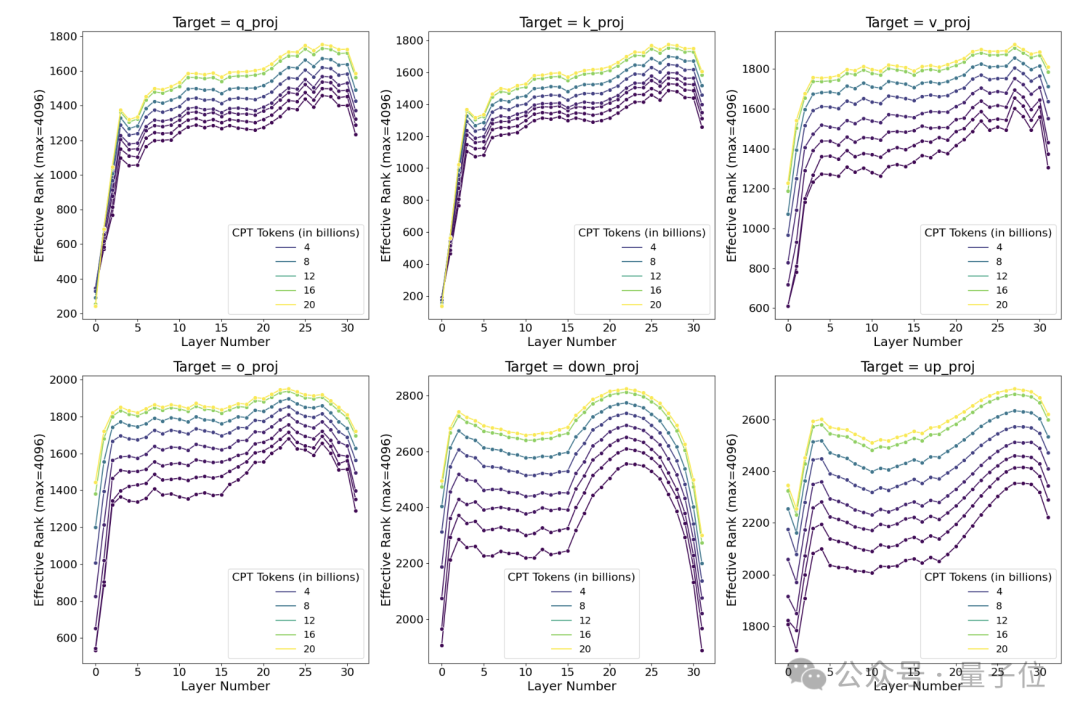 作者对在Llama2上用StarCoder-Python数据集进行持续预训练过程中各个阶段的权重矩阵进行了奇异值分解。