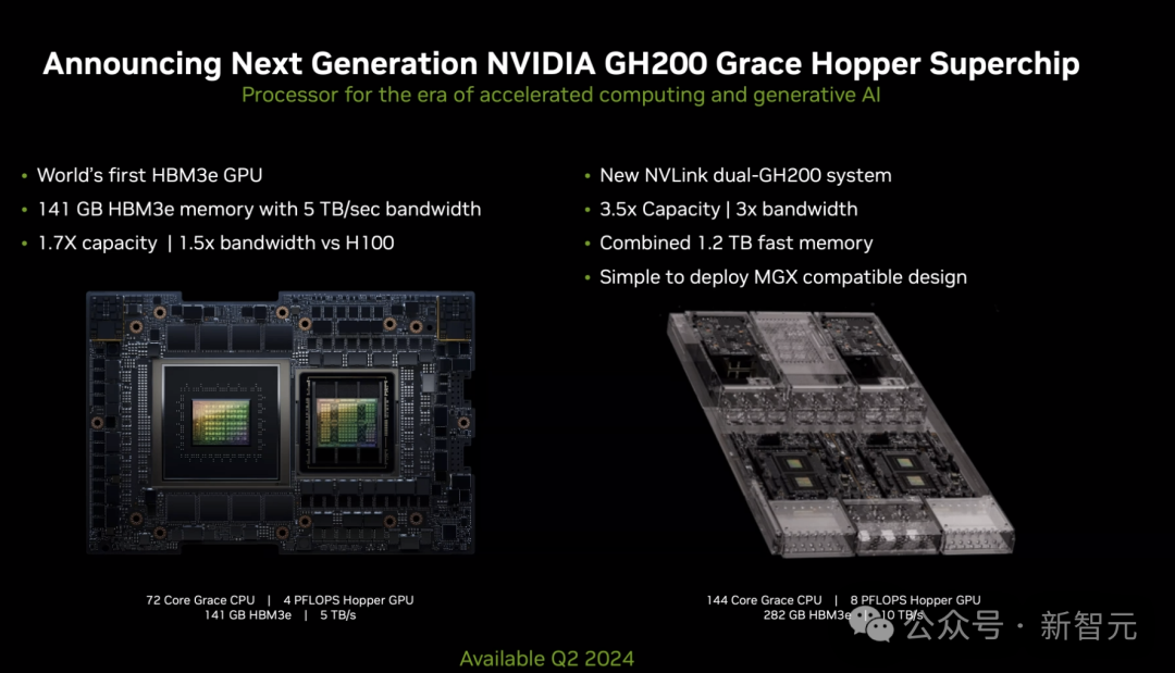 在单个服务器上,通过NVlink连接的双GH200芯片可以提供比H100高3.5倍的GPU内存容量和3倍的带宽。