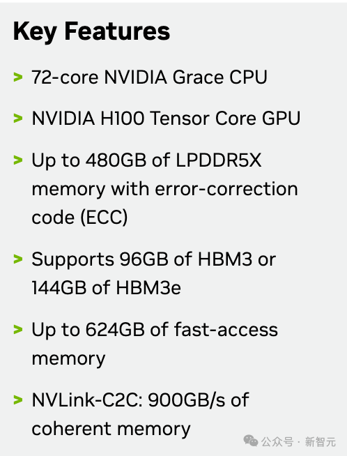 该系列中的GH200芯片在AI和高性能运算方面有非常强大的能力,单个GH200芯片由一个72核Grace CPU和一个H100 GPU组成,内存容量最高可达624GB。