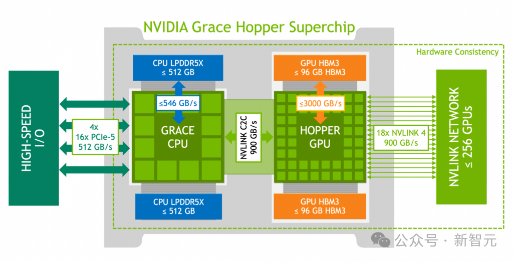 英伟达的NVLink技术就是为了解决通信问题,GH200中的CPU和GPU通过NVLink C2C连接在一起,提供900GB/s带宽,是第五代PCIe带宽的7倍。