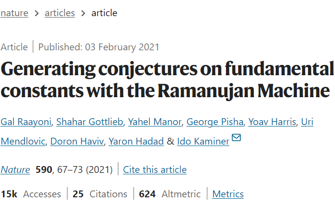 2021年,研究人员设计的拉马努金机为基本常数生成了新的公式,例如 π 和 e,模型通过详尽地搜索连分数族(families of continued fractions)来实现该算法,其中连分数是一种特殊的分数表示法,由无限多个分数层叠构成,每个分数的分母本身也是一个分数,形成了一个分母链。
