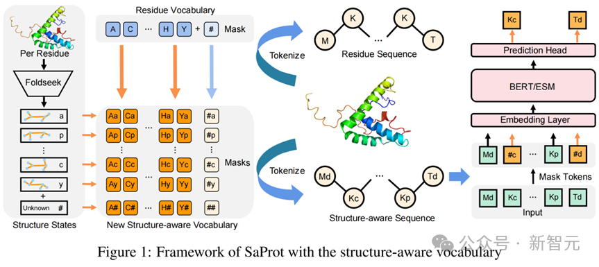 西湖大学的研究人员利用Foldseek来处理蛋白质结构,将其编码成一维的离散token,并与传统的氨基酸进行结合,形成了结构感知词表(Structure-aware Vocabulary),以此将结构信息嵌入到模型输入中,增强模型的表征能力。