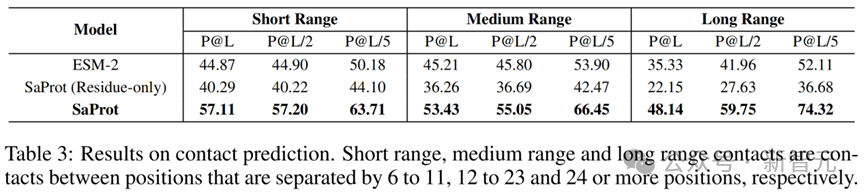 SaProt在4000万的蛋白质结构上进行训练,获得了强大的表征能力。一个可能的疑问是如何确定SaProt学到了更多的结构信息而不是模型被训练得更好?论文对SaProt和ESM-2在残基接触预测任务(Contact Prediction Task)上进行了测试。作者冻住了模型的backbone,只训练一个线性分类层。